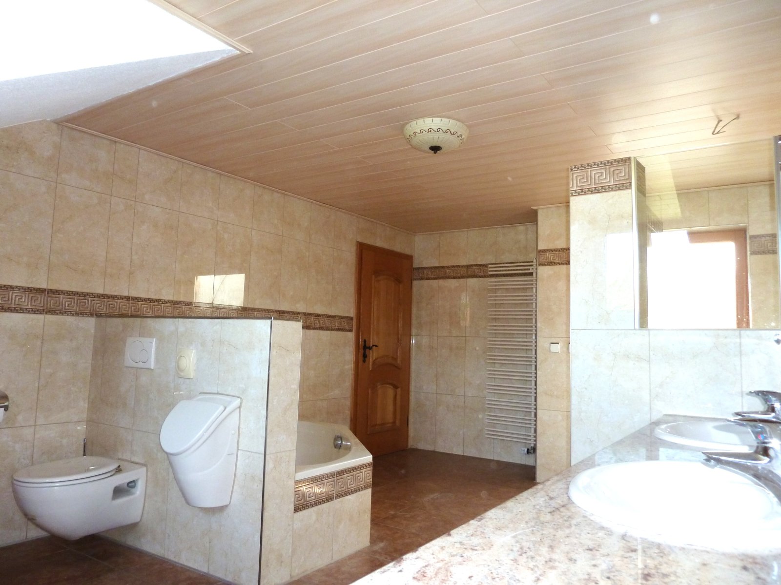 - Tageslichtbad mit Eckwanne, ebenerdiger Dusche, Einbauschrank, WC, Urinal und Doppelwaschbecken